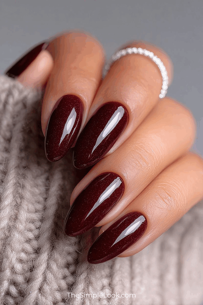 If there were one color that defines winter luxury, it’s deep bordeaux — that lush, wine-red that catches the light like velvet. This manicure layers a soft matte velvet finish over a dark burgundy base, giving the illusion of texture without actual 3D art.
