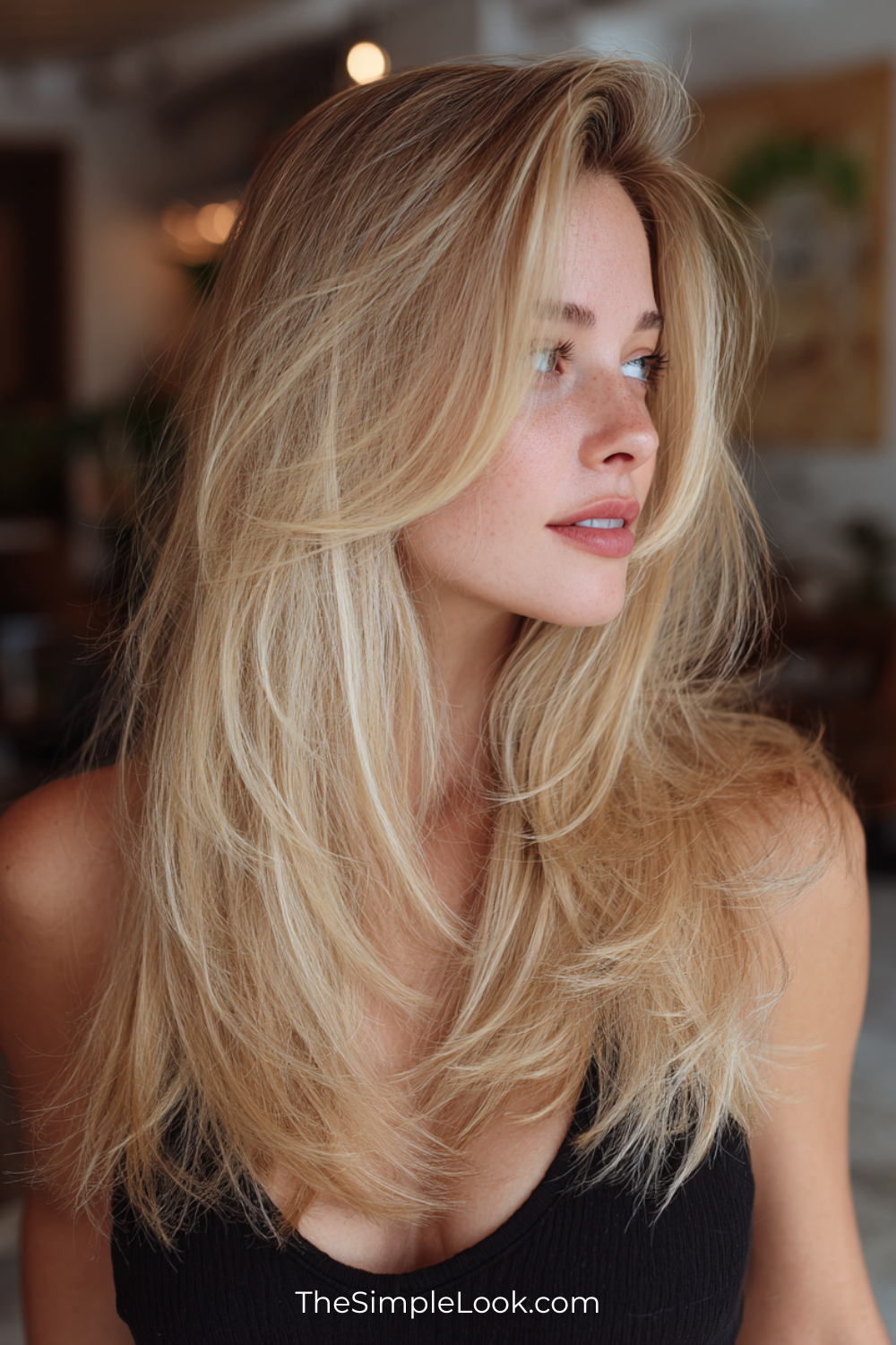 Why it works: Shorter, stacked layers at the crown elevate flat hair, creating the illusion of a fuller top. Works beautifully on long hair that tends to lie flat.