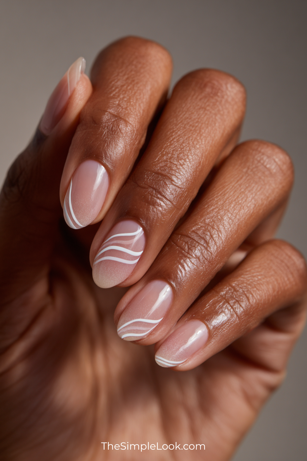 Paint soft swoops or angular micro-lines that frame the nail off-center. Stick with muted shades — cream, taupe, and pearl shimmer — to keep the effect elegant, not chaotic.
